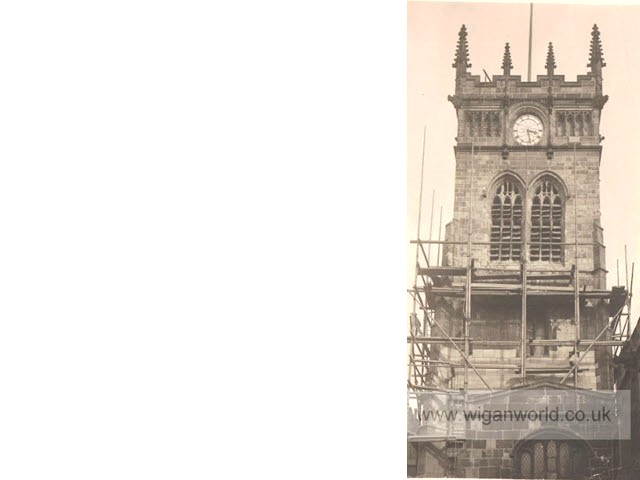The work began in 1898. The whole of the exterior stone work was repointed and cleaned, renewed where necessary, and given three coats of szerelmey to preserve it. All the many pinnacles were taken down, reset and dowel led with copper, instead of iron which had caused them to decay. The roof was repaired where necessary and the vestry roof reslated. All the clerestory windows were re-glazed. The porch was cleaned, the statues replaced and the windows glazed. Inside the church, the stonework was cleaned and the plaster renewed in places, though it was stripped from the arches of the Tower and Walmesley Chapel.