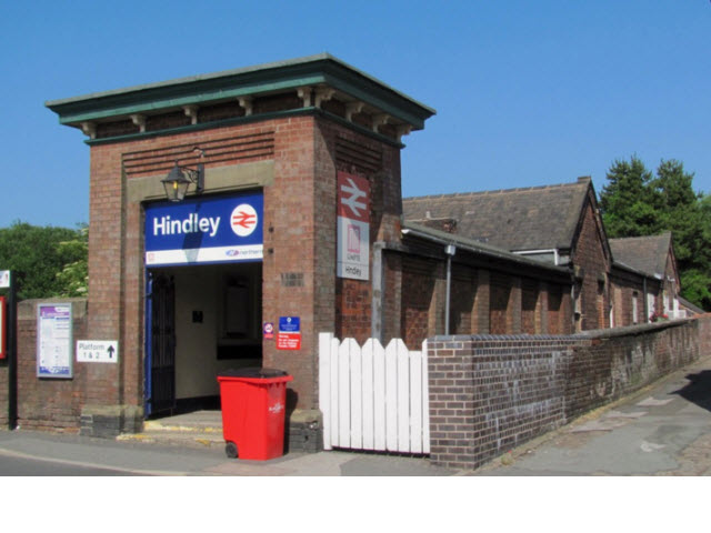 his station was opened on 20 November 1848 and was originally named Hindley. It was renamed Hindley North on 1 July 1950 to differentiate it from Hindley South station on the line from Wigan Central to Glazebrook. Hindley South closed in November 1964, and Hindley North was renamed Hindley on 6 May 1968. There were also stations serving Hindley at Platt Bridge and at Hindley Green (both closed in 1961) on the line from Wigan North Western to Manchester Exchange, the residual "fast local" and express passenger service ceasing on 1 January 1968. At Hindley there are now two platforms in use, with the overgrown remains of two further platforms (for the fast lines taken out of use on 21 November 1965.)