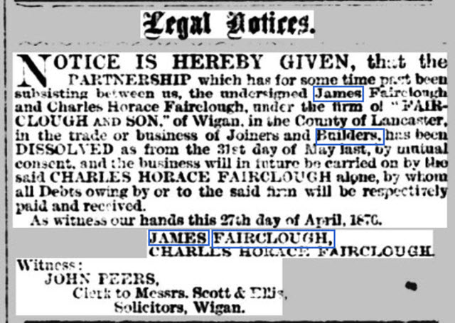 Due to failing health in 1876, James transferred sole ownership of Fairclough & Son to his son, Charles Horace.